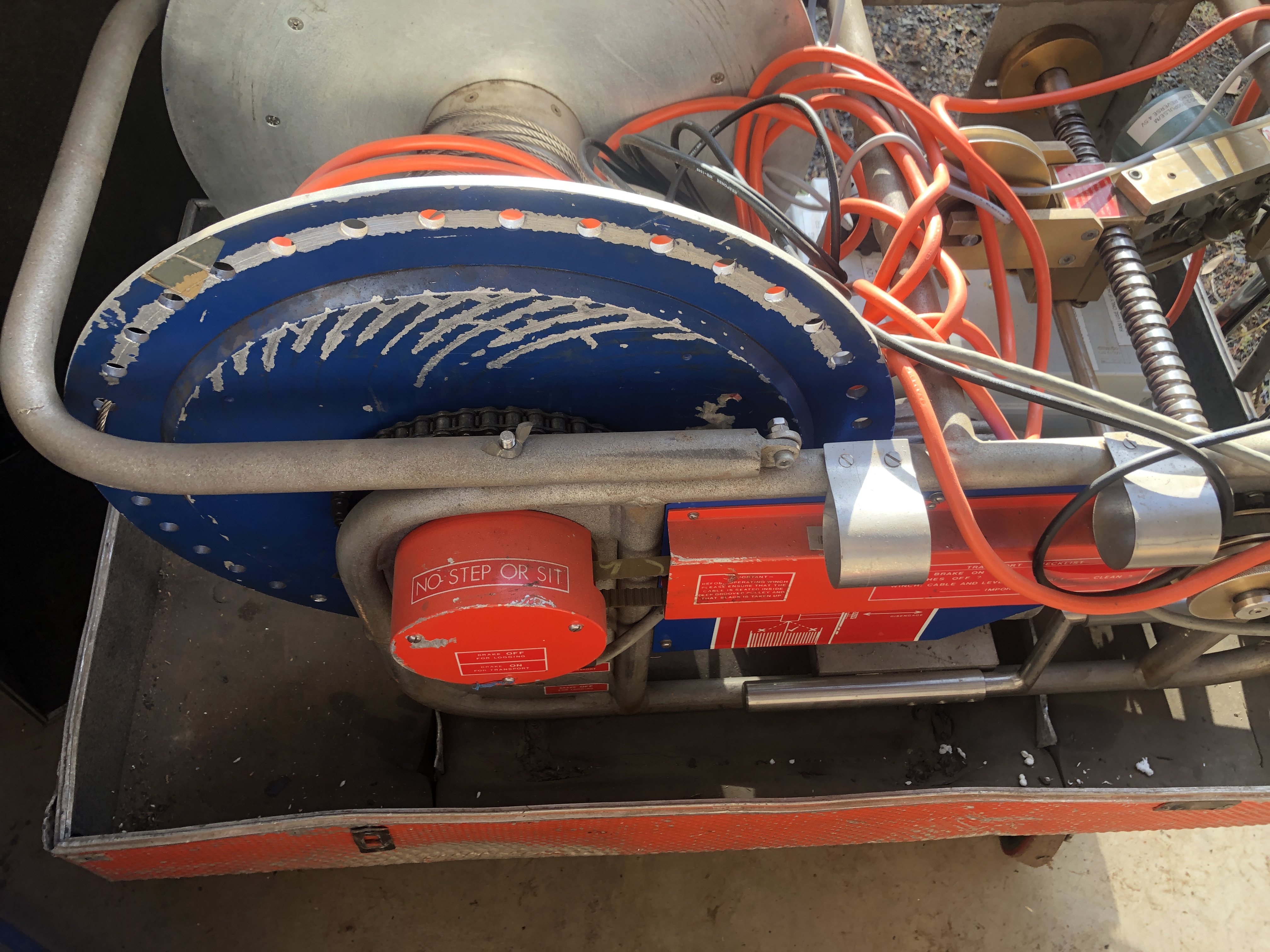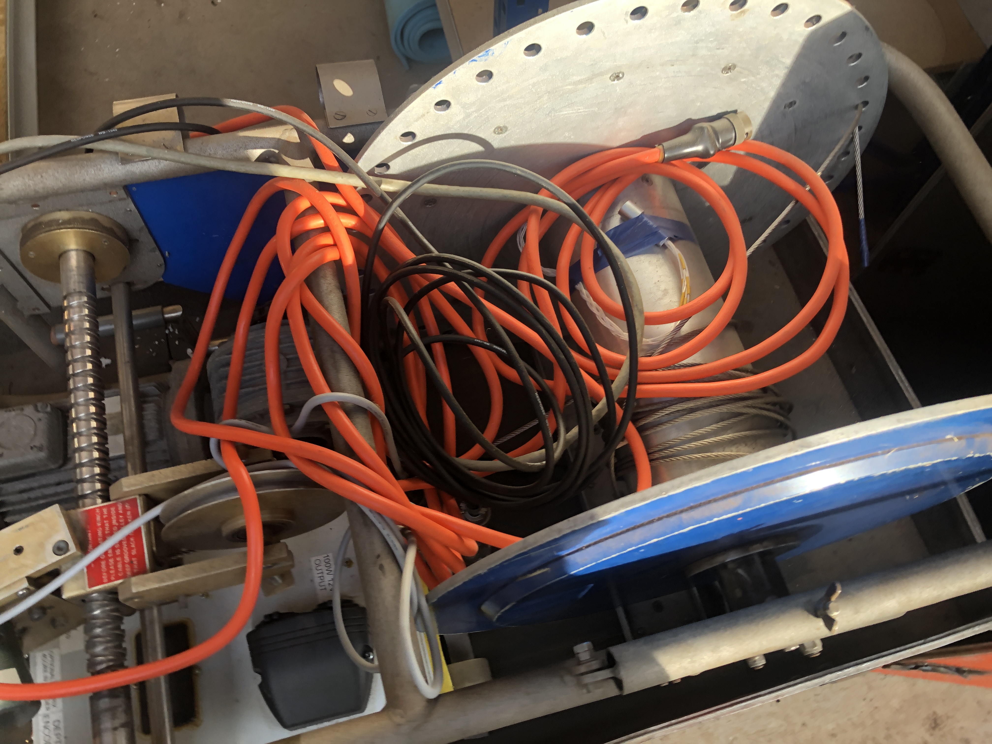 This is the second of the Pluto winches. It has had its optical fibre cable removed leaving only the optical fibre converter/commutator in the hub. Measurements suggest it will accept 1500m of 4 core cable readily. See notes on the ‘Winch 700m 4 core’ for other details.