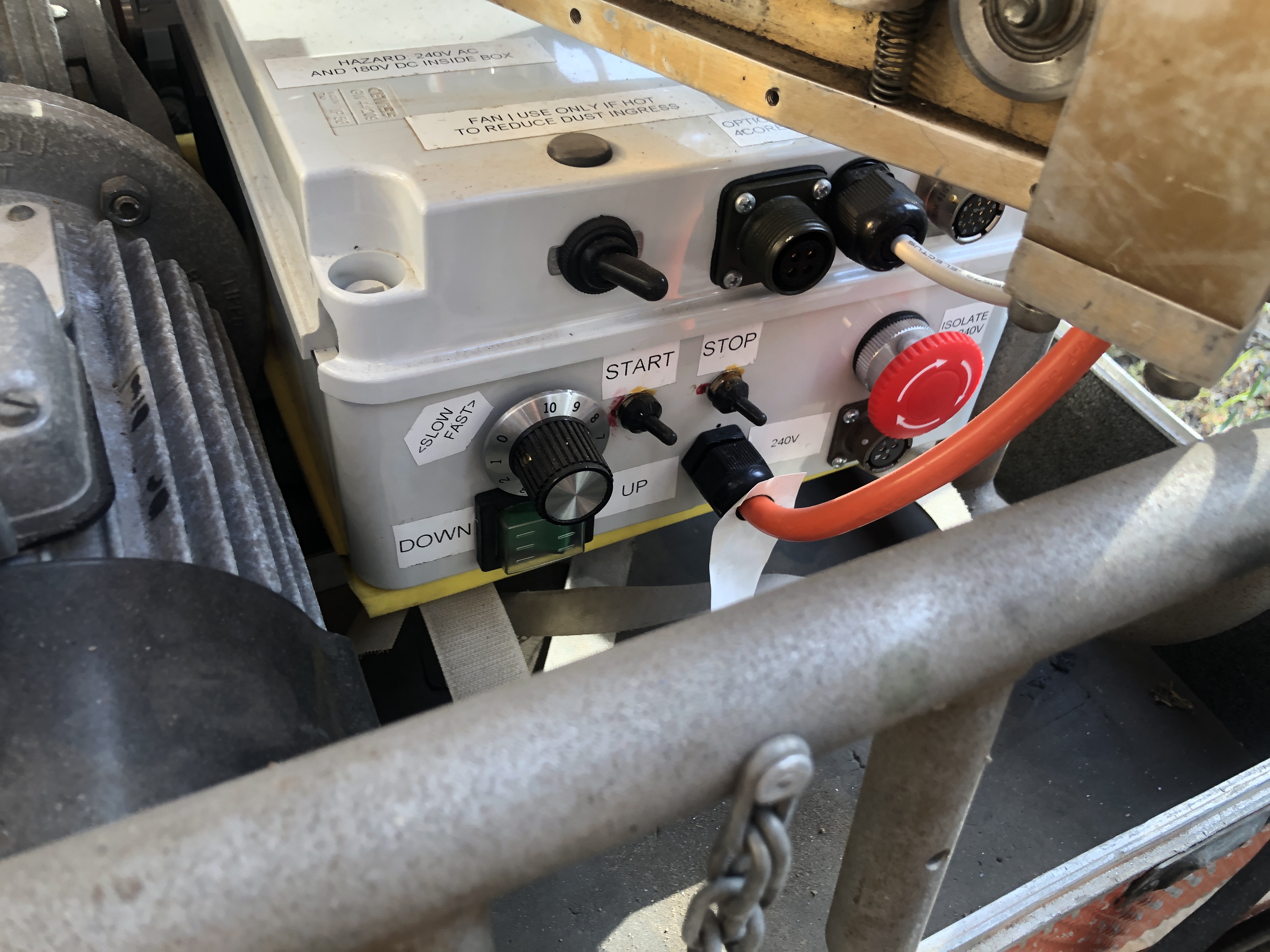 The two Pluto winches appear to be able to hold and operate 1500m of 4 core cable. One is equipped with 700m of steel strand shielded 4-core cable and cable head. Each has a 160V DC motor and 240V AC controller (see ‘Winch Controllers’). The Winches are very compact, have Aluminium shipping boxes, detachable hand cranks, transport brakes (in addition to the 4 quadrant motor braking), and working tested levelwind mechanisms with clutches for hand-correction. Counters are integrated into the levelwind pulleys and integrated with motor operation for constant speed control.