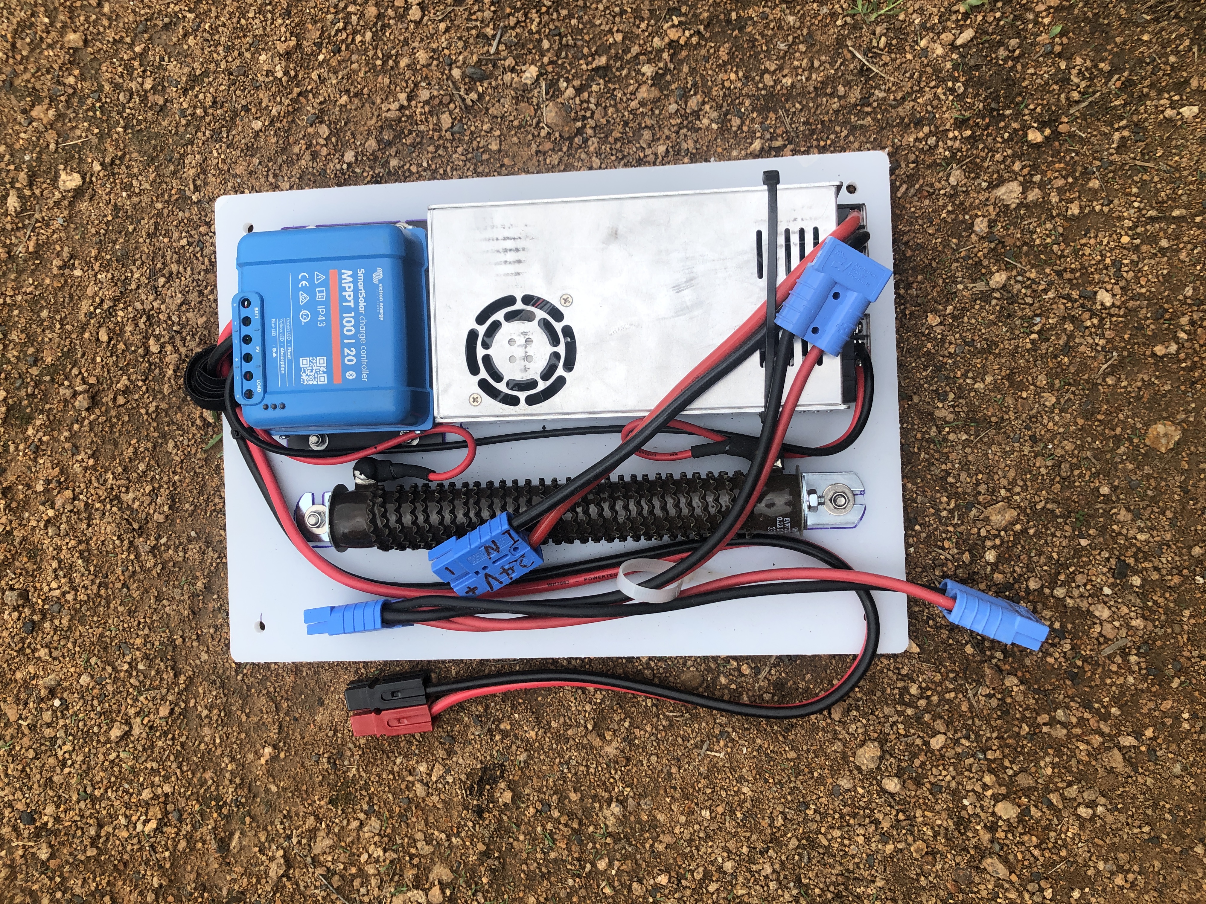 The electric tractor runs on 42-56V (51.2V) but the AgTEM electronics run on 19-32V (25.6V). At times we want to run the tractor off the AgTEM batteries, or to at least charge the tractor battery from the AgTEM batteries. As of January 2025 there was not an off the shelf solution for this so one was made from a MPPT supply, 24-48V converter and a power resistor. It is far from perfect due to the inefficiency of damping input to the MPPT with a power resistor but makes do.
