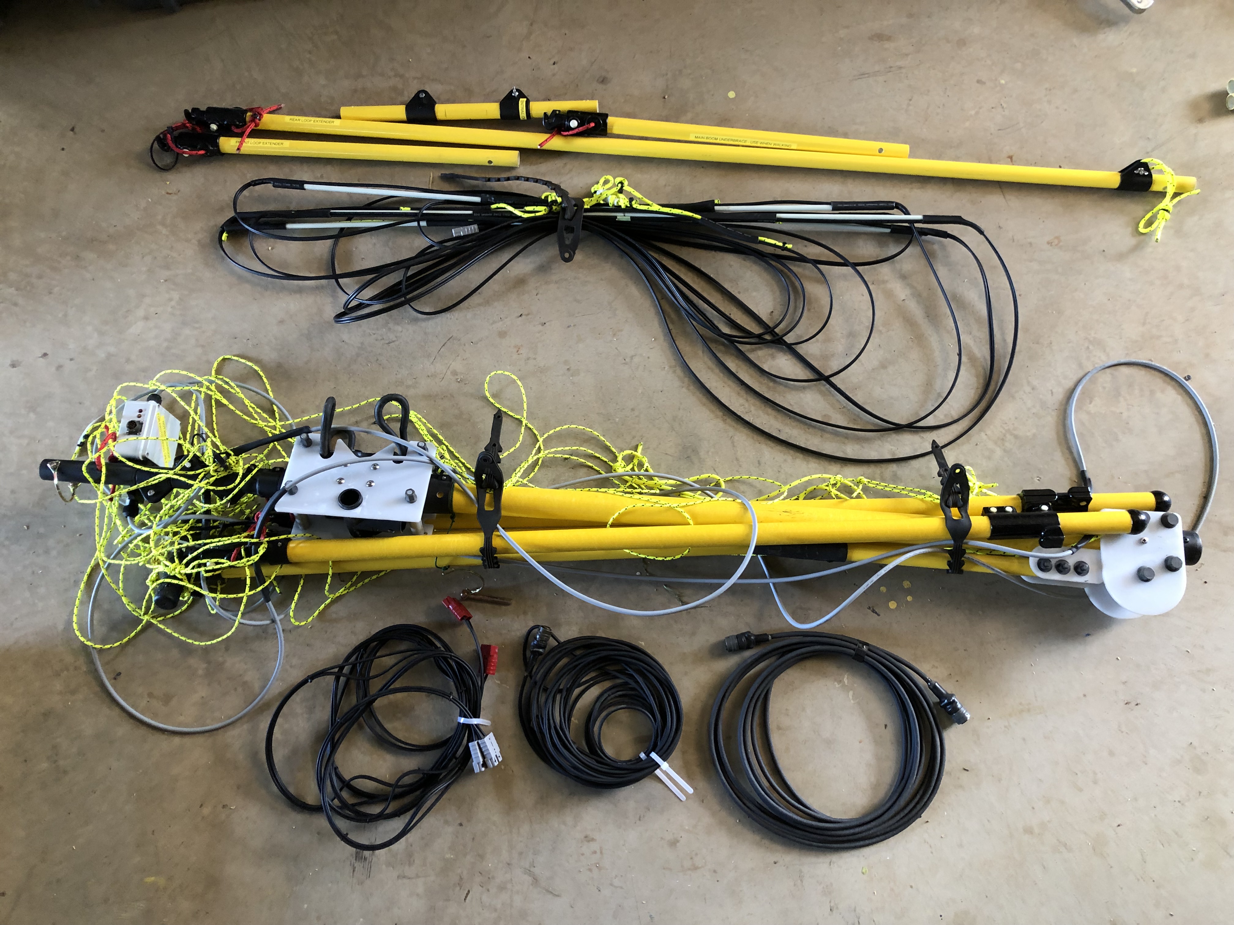 This photo shows all of the 27.8 square metre loop and its support structure dismantled ready for packing. This excludes the wheeled supports and drawbar and is the form the structure would take when two persons are walking along carrying it. Included also are a receiver loop and pre-amp – these stay on the structure permanently as they make it much easier to manage when the telescopic booms are retracted. Included are the longitudinal boom parts, vertical rigging suspension tower, central knuckle and tendon joint block, required cabling and spring rods, three carrying and roll opposition handles and the two transverse telescopic booms.