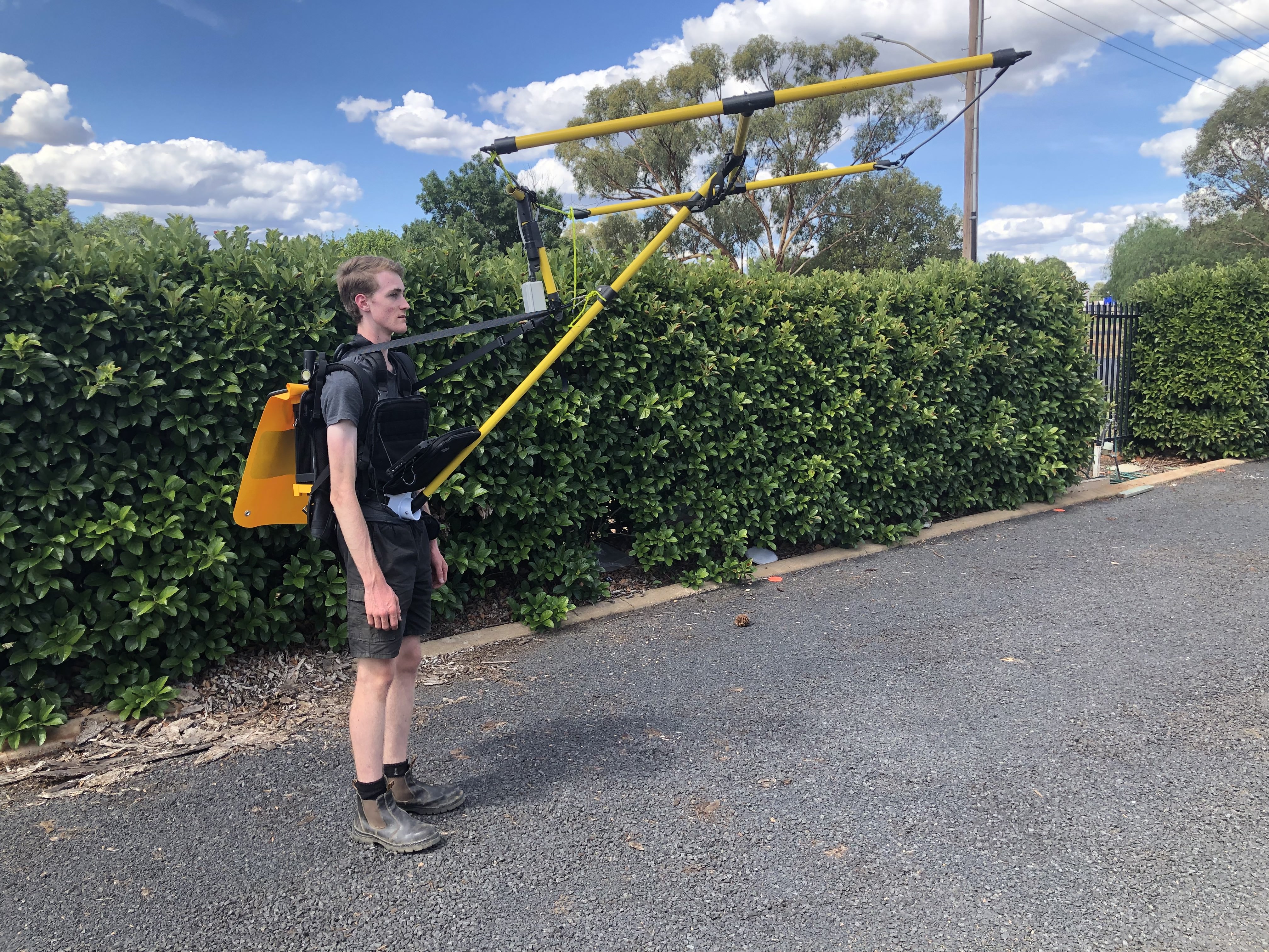An independent roving collapsible 6 square metre or smaller gimbal mounted receiver loop can be walked along by a person with a receiver or other counterweight on their back using a lap pouch and flag-bearers pole type of arrangement. Extra shoulder straps can help stabilize the support pole hands free. Variable mutual induction with metal of the receiver case can be problematic. This can be used as a remote Slingram receiver on the end of a long receiver or synchronization cable, or the receiver may be equipped with GPS synchronization (this synchronization option is not available to us as of January 2025 but is readily supported by several electronics suppliers).