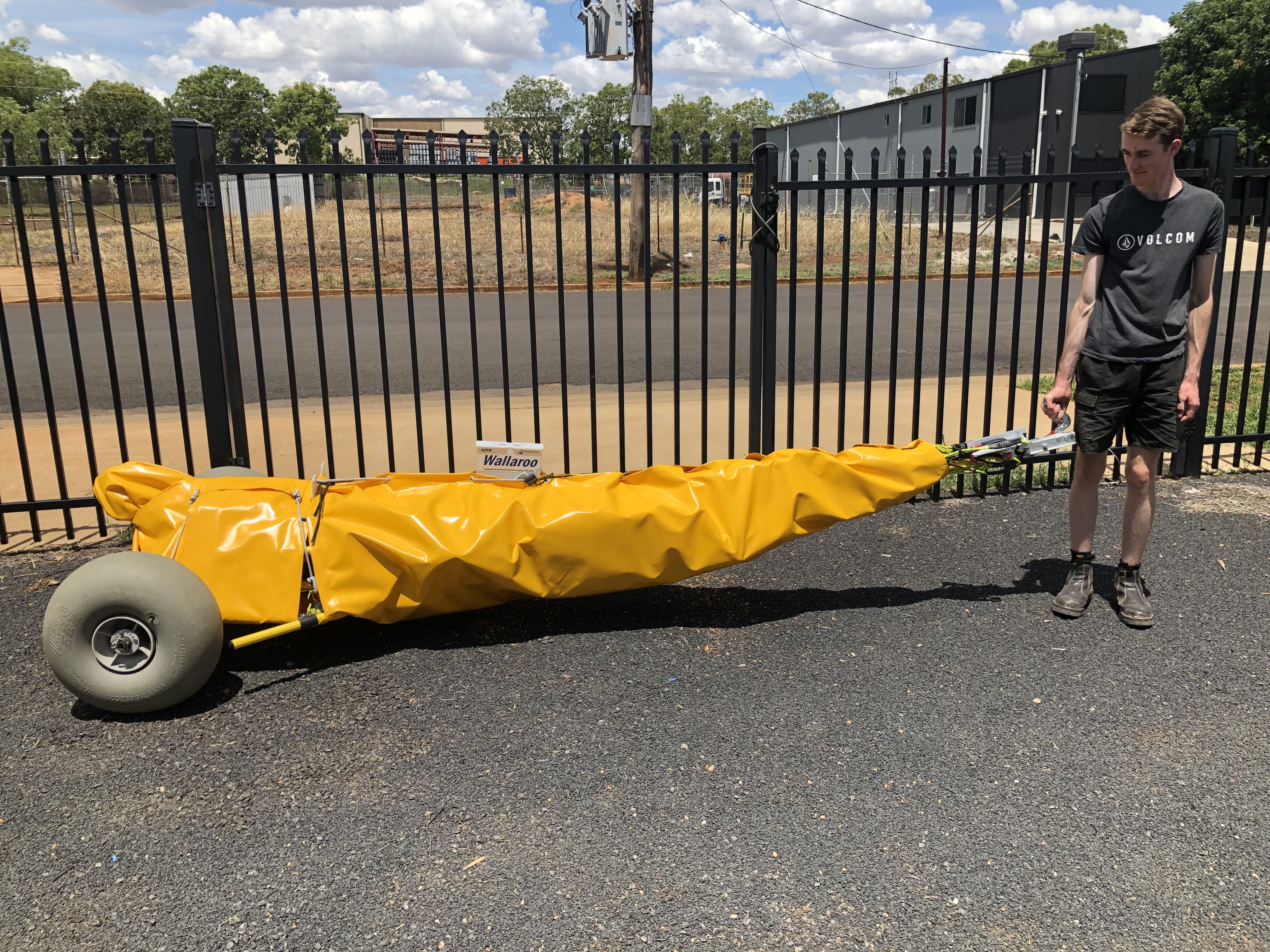 Packed in its bag for quick packdown (not fully dismantled) the Wallaroo cart and loop structure resembles a Formula 1 race car. The system collapses into this form without requirement to fully dismantle most parts.