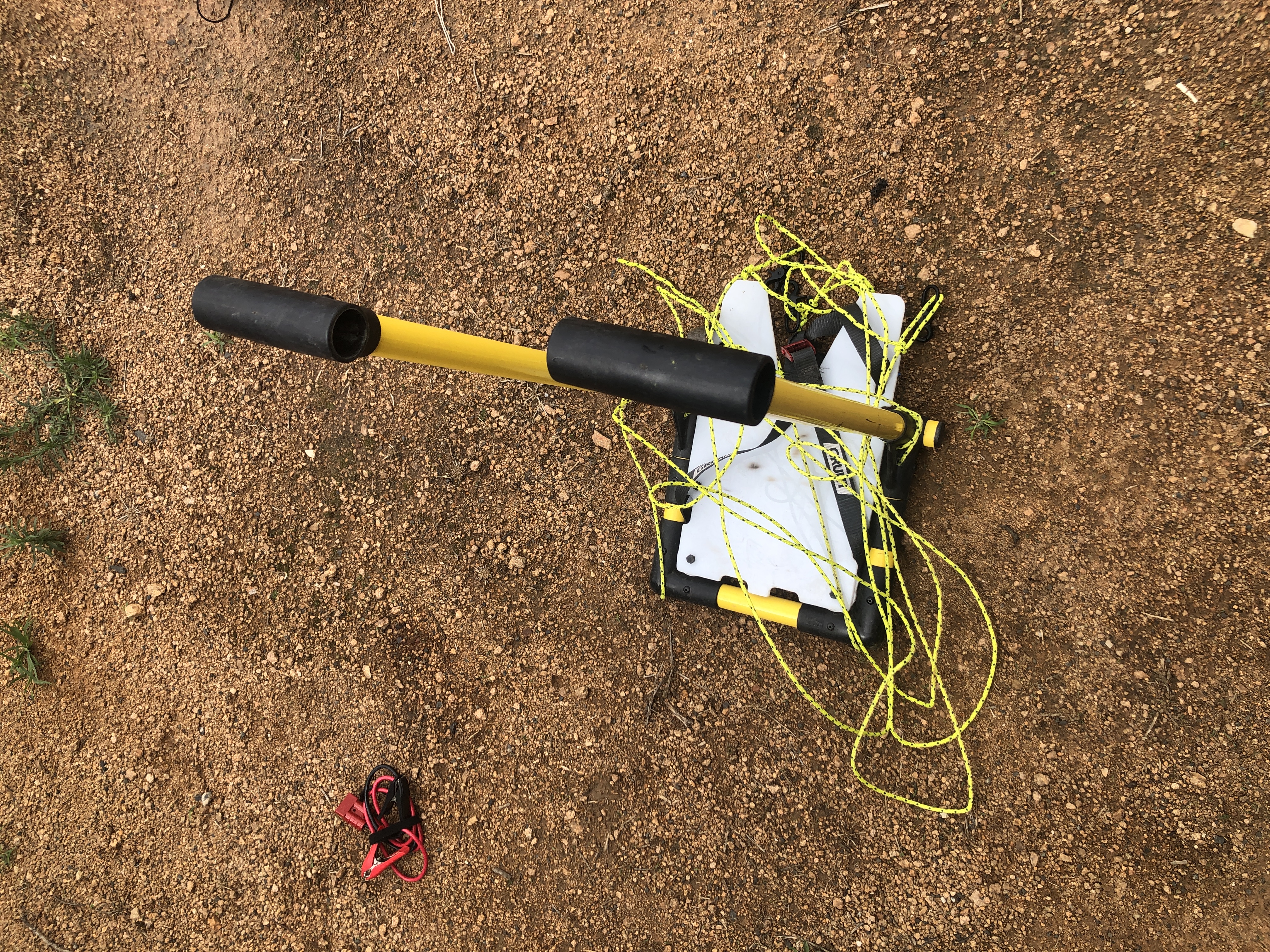 When hand carrying the 27.8 square metre loop structure the battery is suspended beneath the structure centre and must be void of metal casing. This structure is added to suspend the battery and supplies bracing posts for lower rigging needed to prevent sagging of the longitudinal boom.