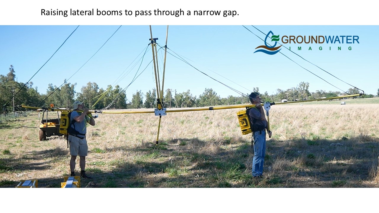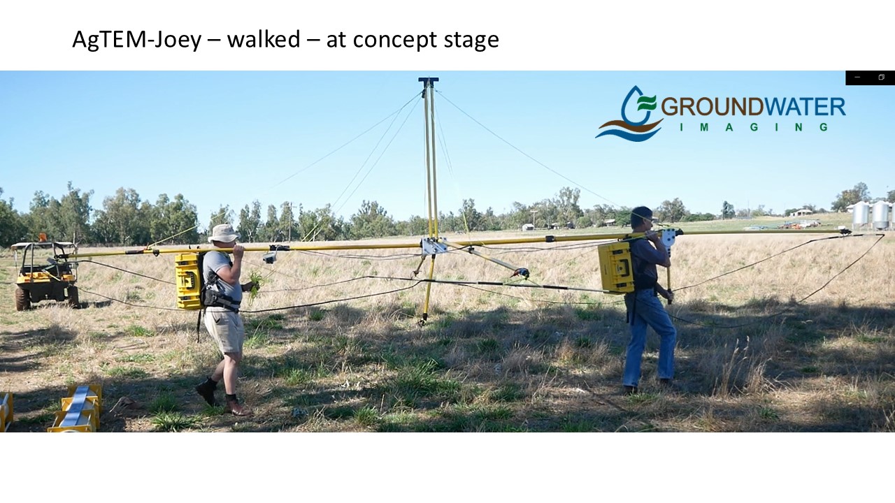 The large Wallaroo transmitter loop, along with the receiver loop centred within, and all electronics, can be carried by two persons if AgTEM electronics is adopted. The transmitter backpack position is rigidly fixed within the loop and the receiver electronics is rigidly fixed out in front of the large transmitter loop on an extension of the longitudinal boom. High performance amplification and A/D conversion generates considerable heat (almost by definition) so extruded aluminium casing is needed for heat transfer rendering this case inappropriate for locating within the large Wallaroo loop when optimized for receiving data via receiver loop centred within the transmitter loop. The computer screen is in-loop but rigidly fixed away from loop wires.
