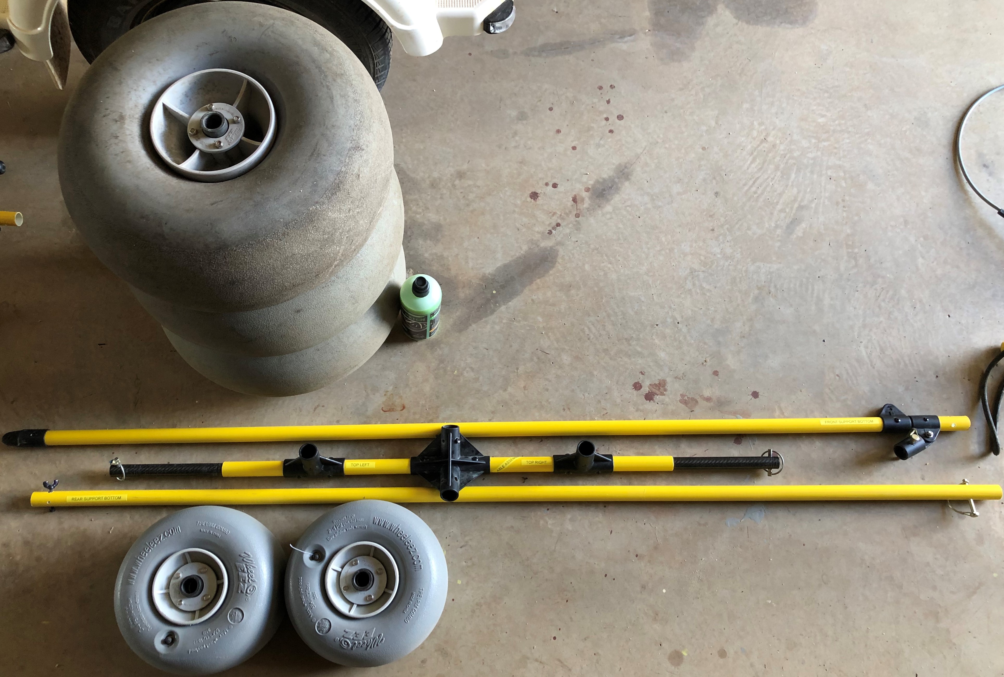 The photo presents the dismantled supports with both large and small wheels as options. Small are good for smooth ground and for if the system is ad-hoc suspended under a landing craft such as a large drone or small helicopter (not with AgTEM electronics unless our electronics provider gives permission).